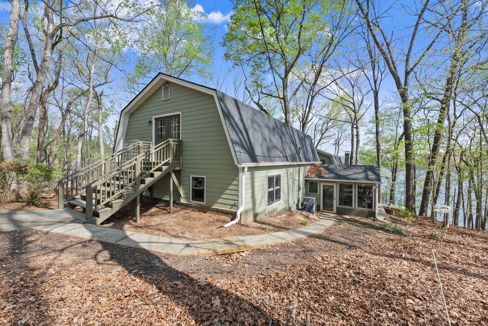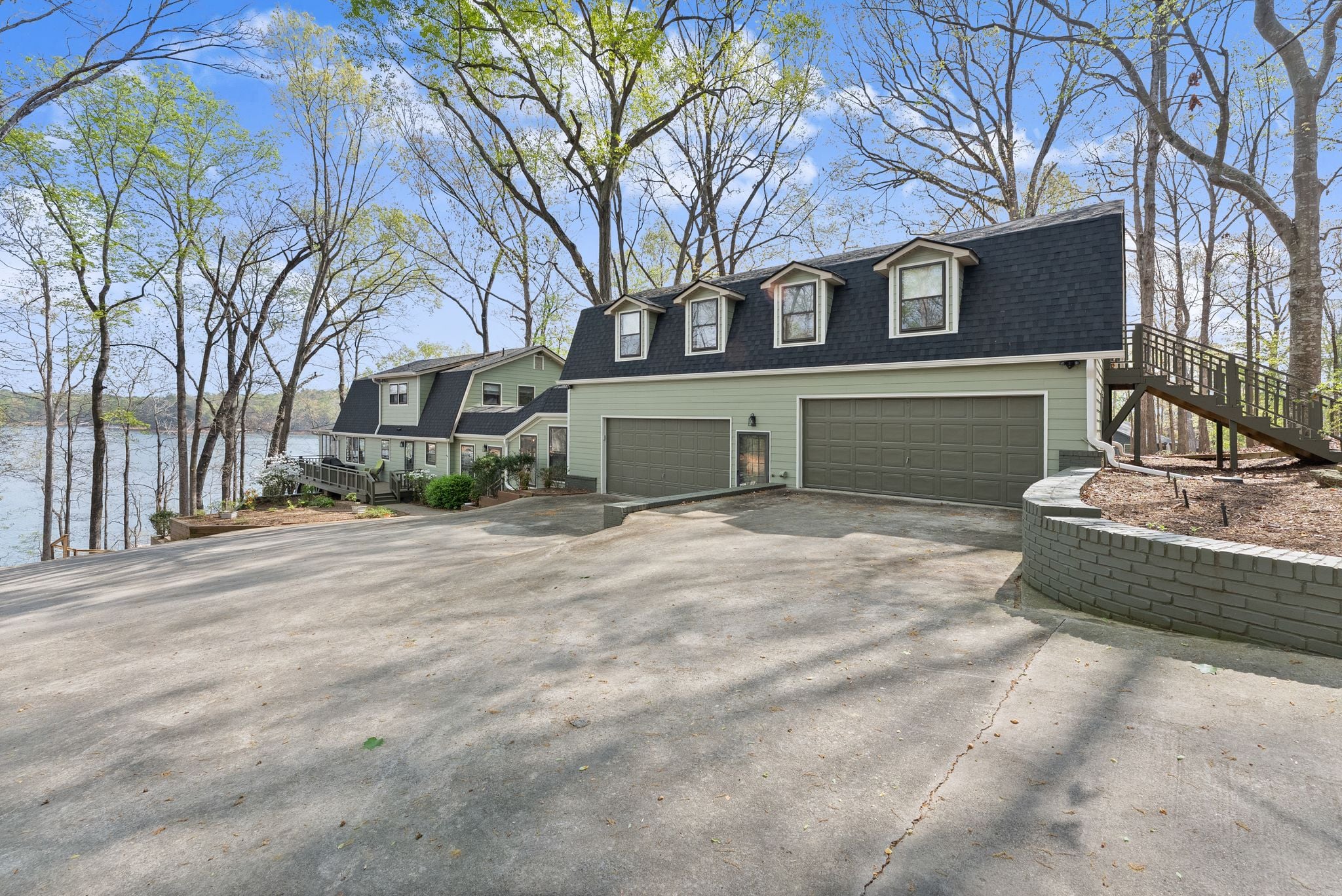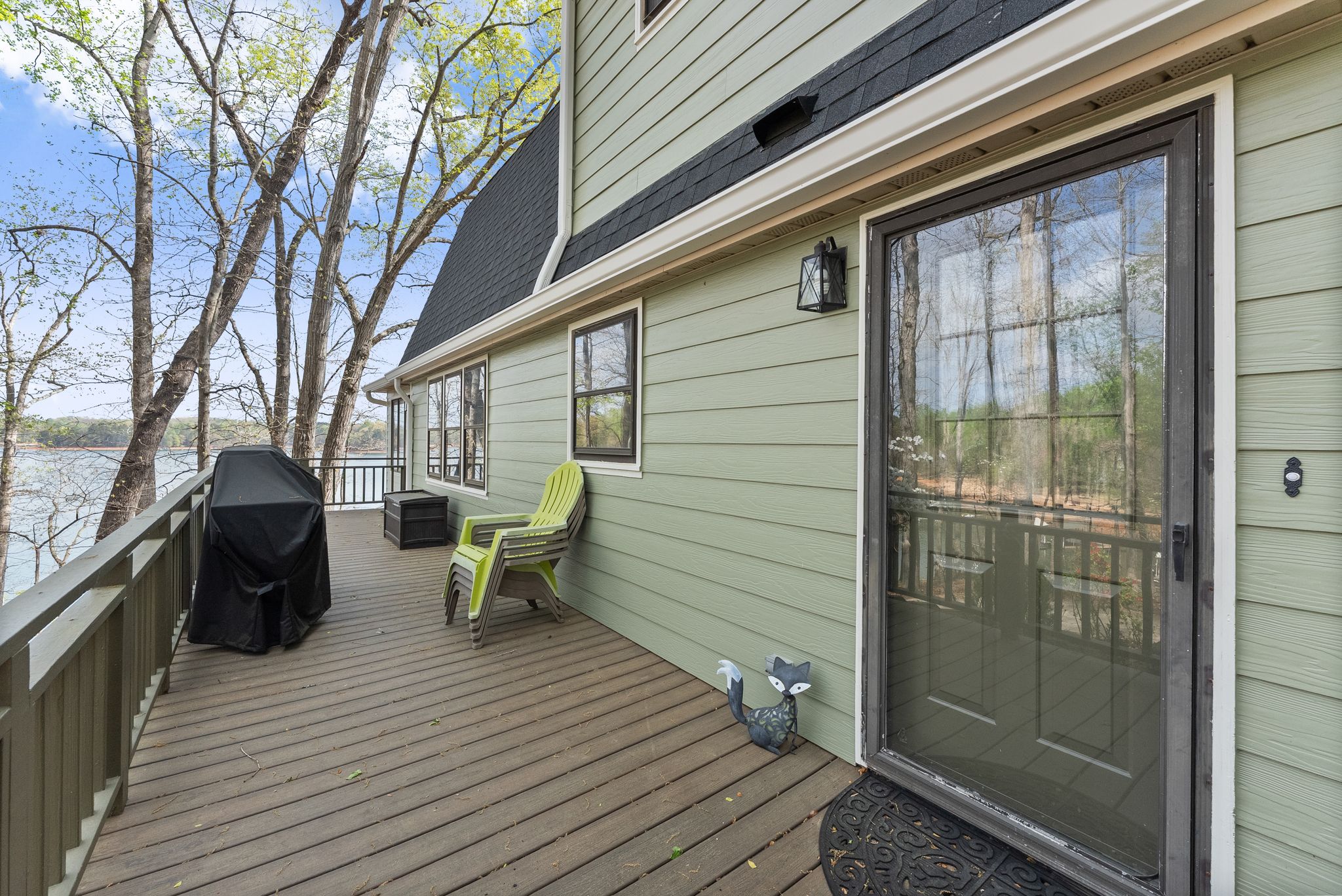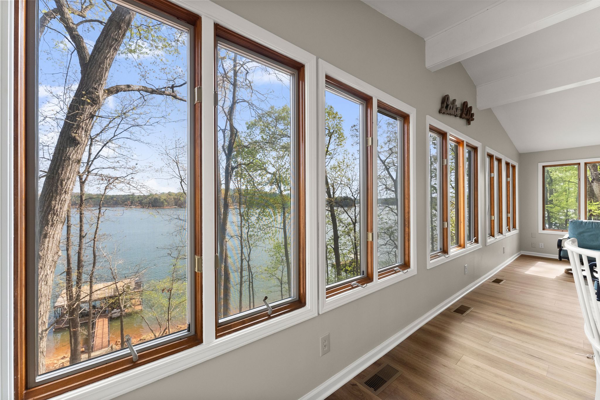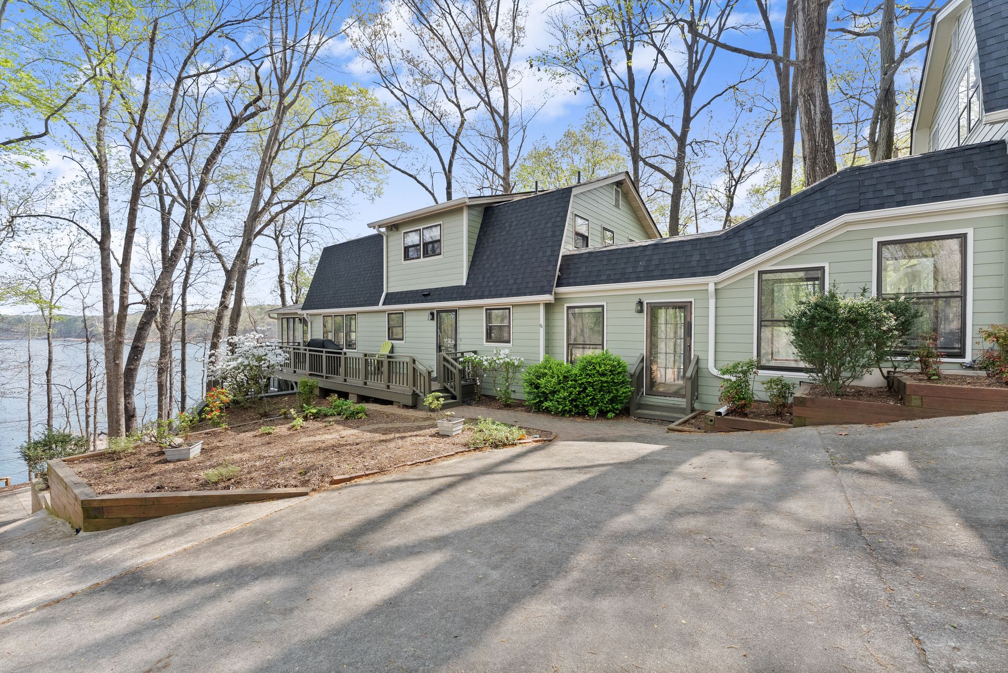 Outdoor living is where this property truly stands out. Multiple levels of decking create the perfect setup for relaxing or entertaining, from the spacious covered lower porch to the upper sunroom and adjoining side porch. A sloped path leads down to the shoreline and your two-story, double-slip dock — complete with boat and jet ski lifts, upper-level sun deck, and year-round deep water — making it easy to spend full days on the lake with family and friends.
