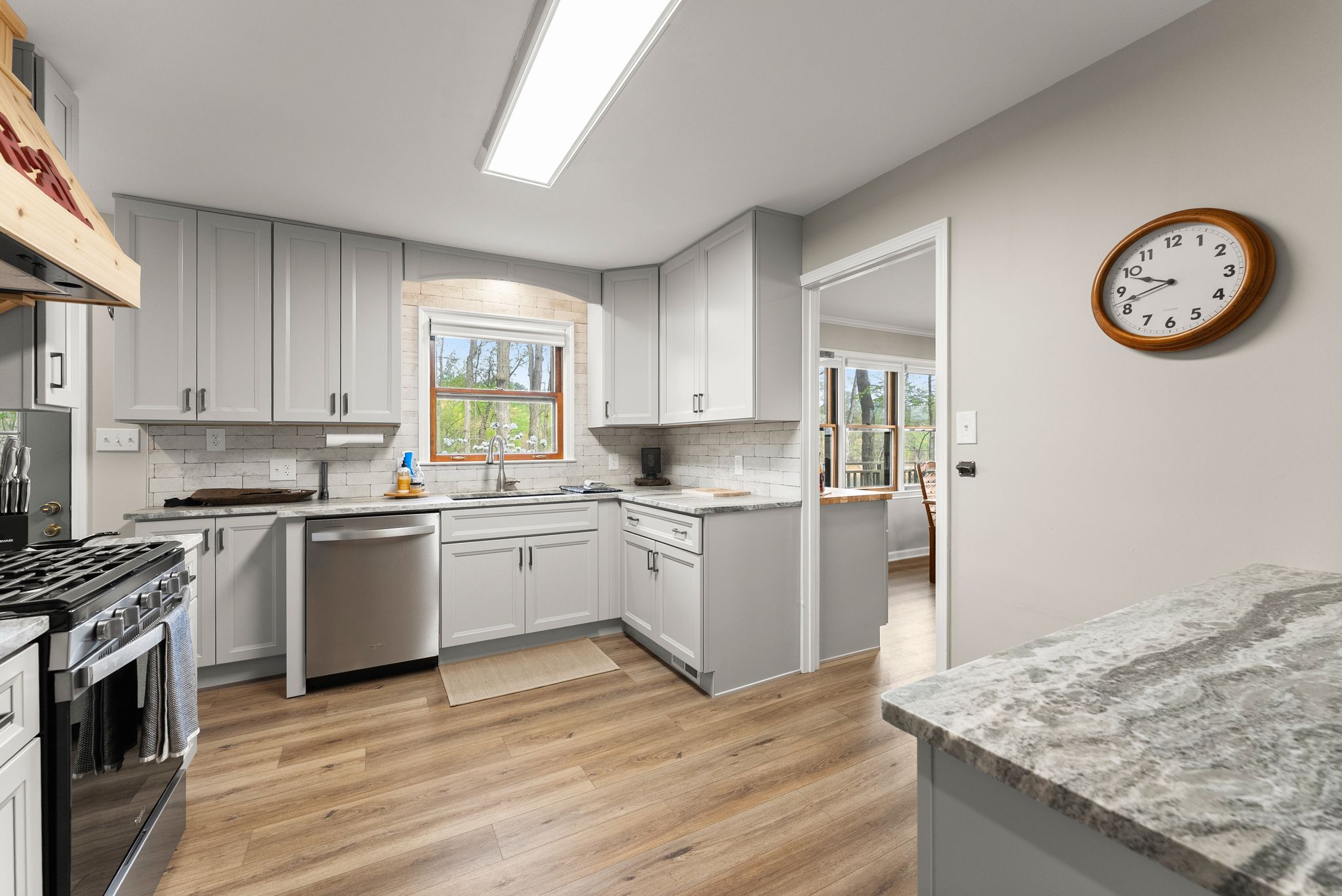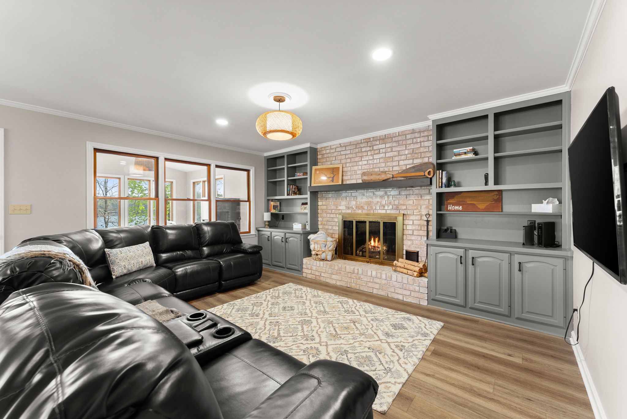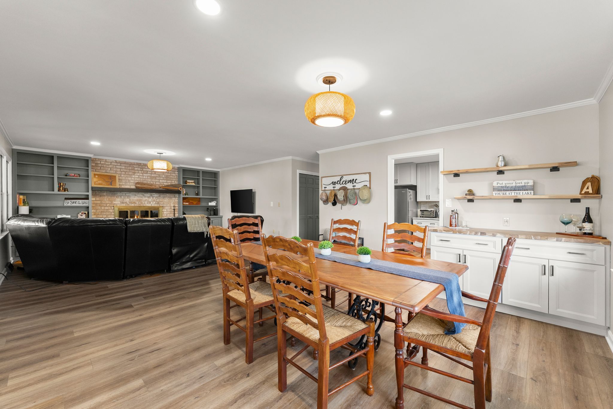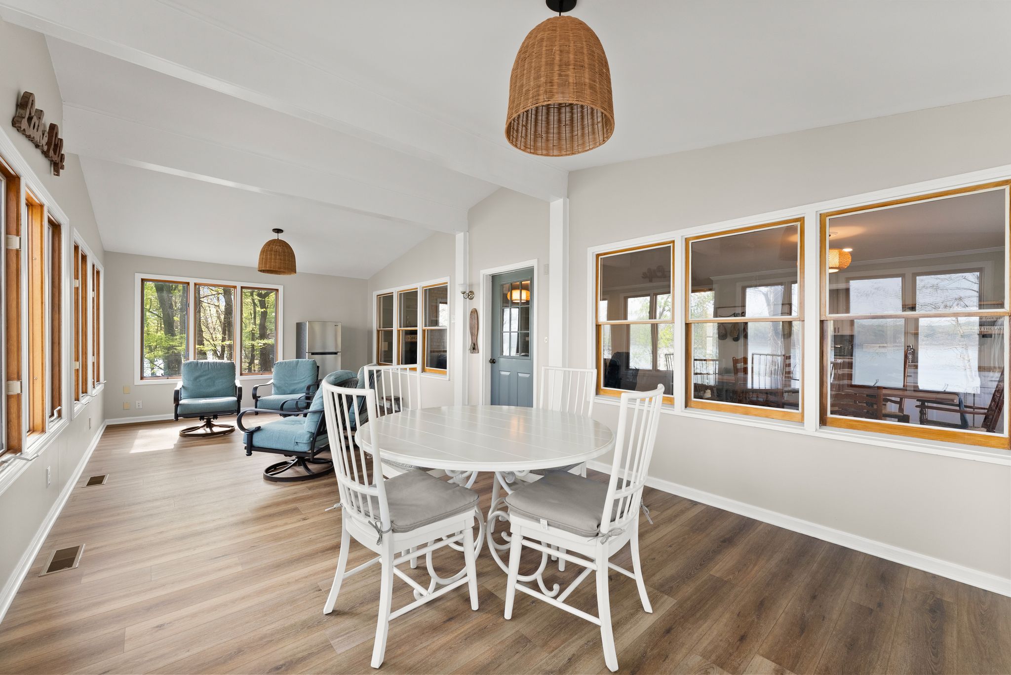 Inside, the main level features an inviting, open-concept layout designed for both everyday living and entertaining. A masonry fireplace anchors the living and dining areas, while the updated kitchen offers granite countertops, stainless steel appliances, and ample cabinetry with a clean, modern feel. Just off the main living space, a bright, window-lined sunroom with its own dedicated mini split provides a comfortable, year-round space to take in the lake views.
