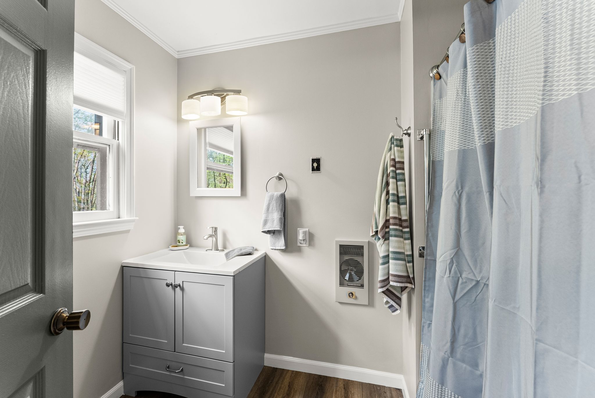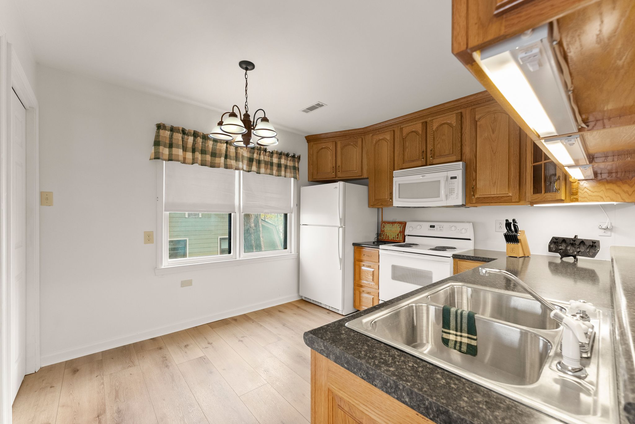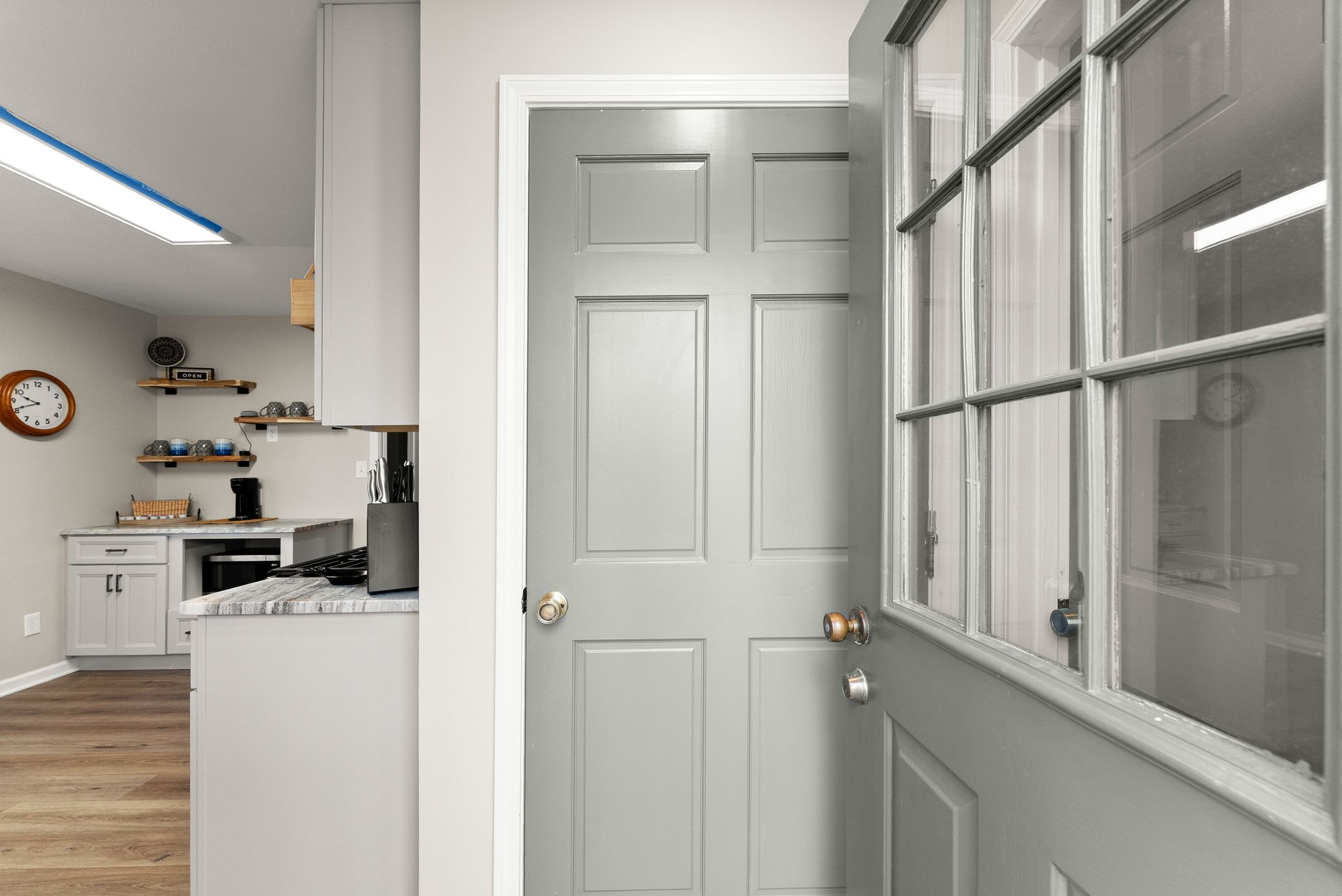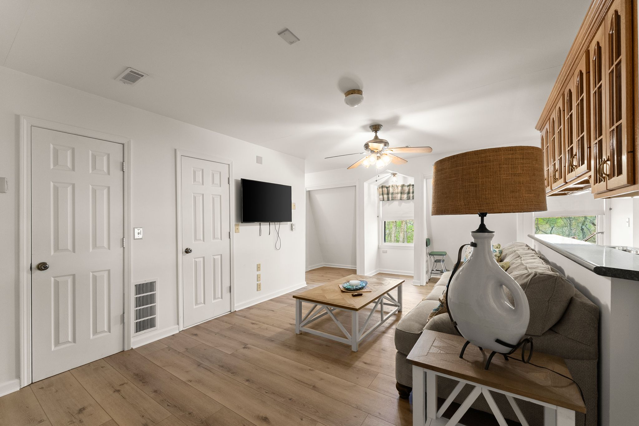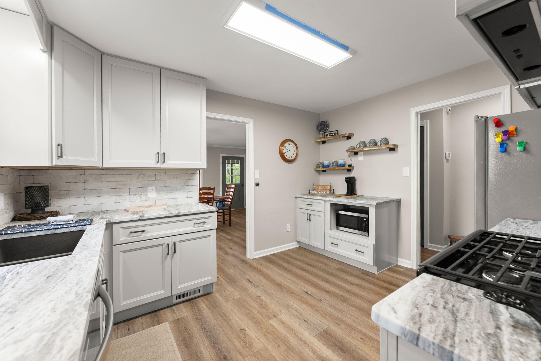 Inside, the main level features an inviting, open-concept layout designed for both everyday living and entertaining. A masonry fireplace anchors the living and dining areas, while the updated kitchen offers granite countertops, stainless steel appliances, and ample cabinetry with a clean, modern feel. Just off the main living space, a bright, window-lined sunroom with its own dedicated mini split provides a comfortable, year-round space to take in the lake views.