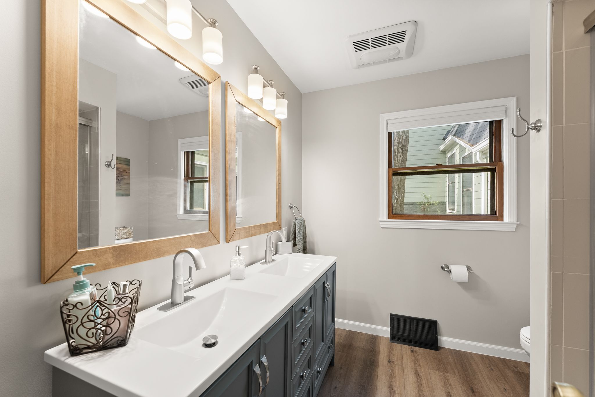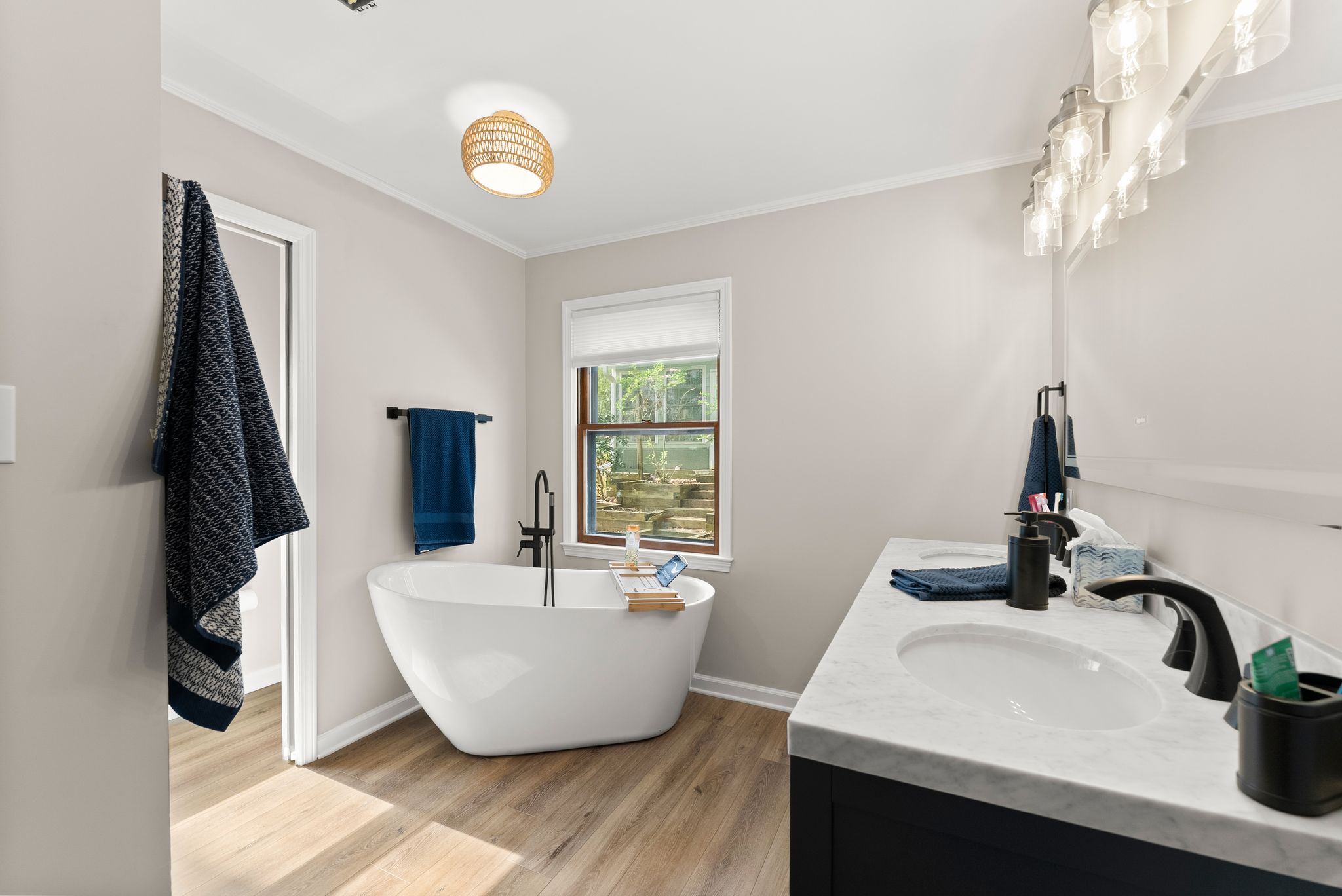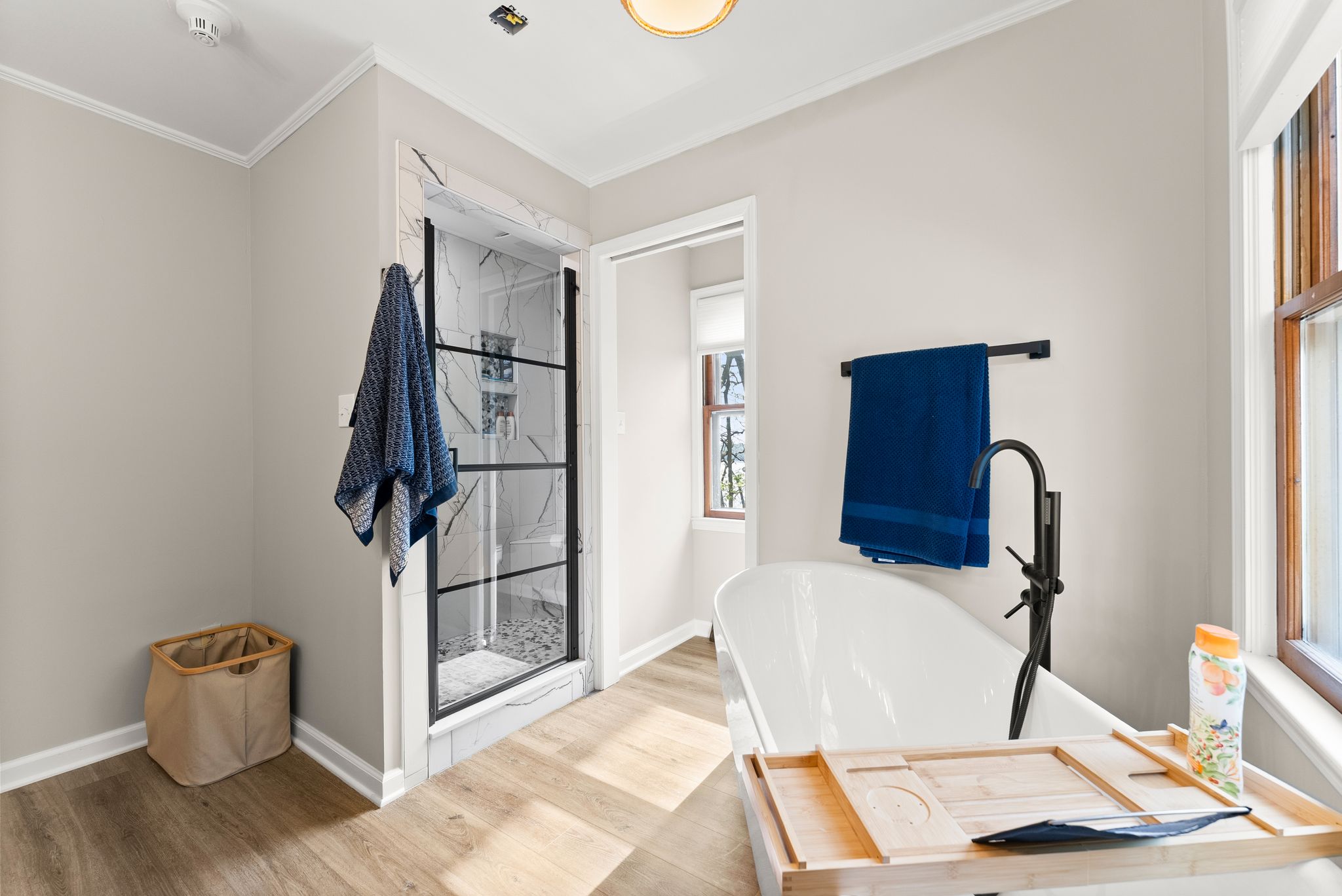 The primary suite on the main level is a true retreat, offering dual closets and a fully renovated spa-style bath with a double vanity, freestanding soaking tub, and a tiled walk-in shower. Upstairs, three additional bedrooms with walk-in closets provide plenty of space for family and guests.