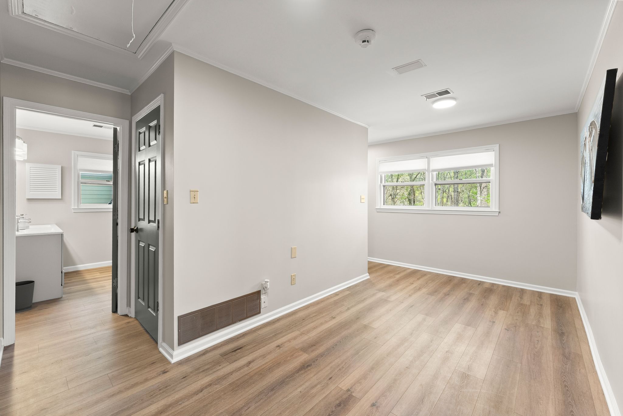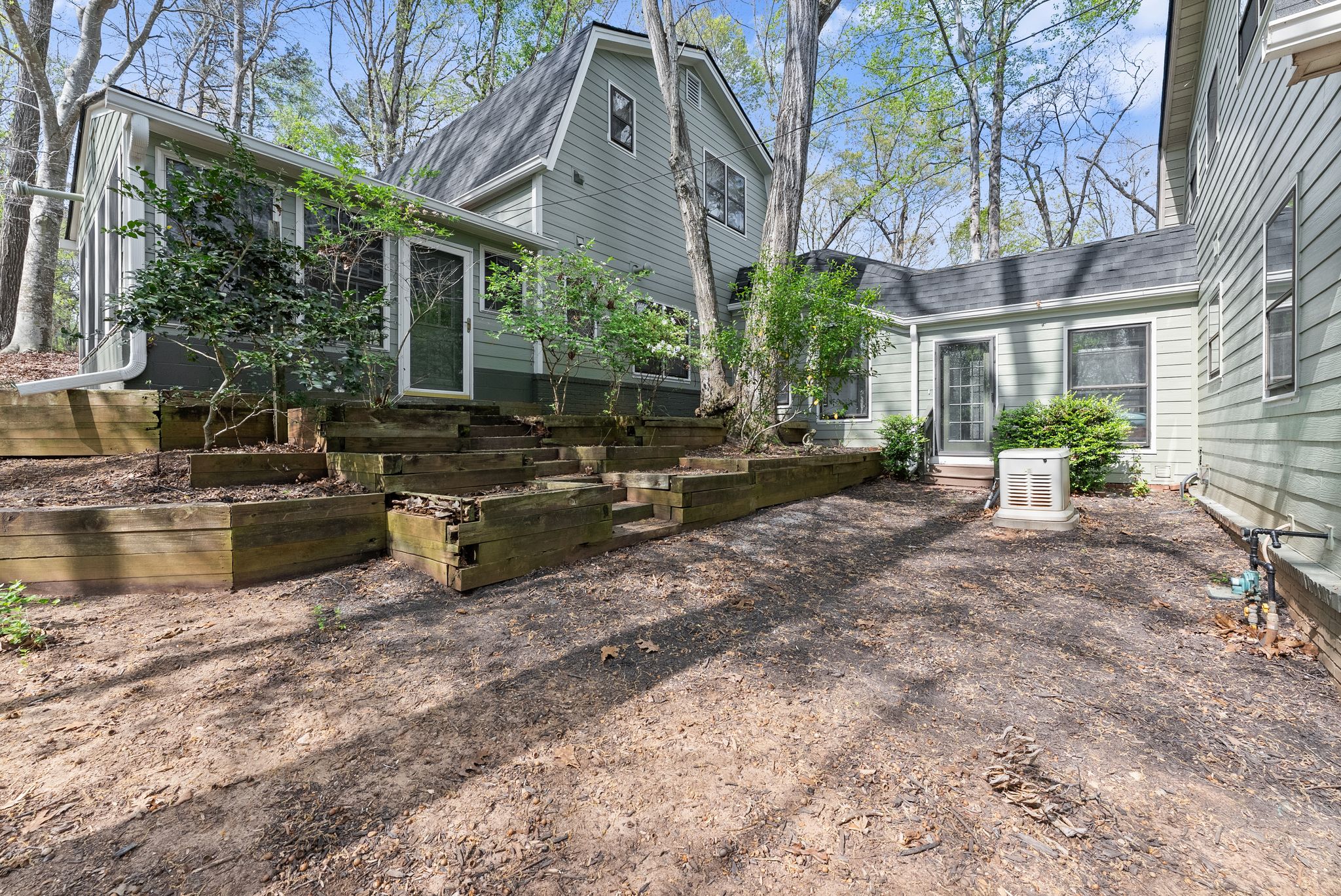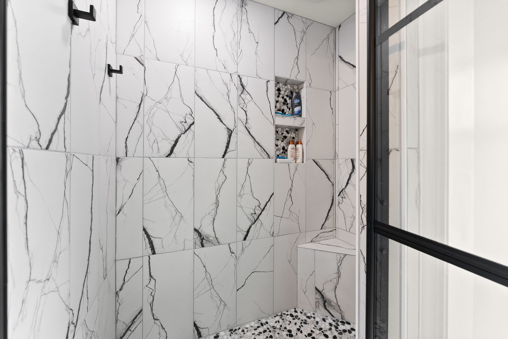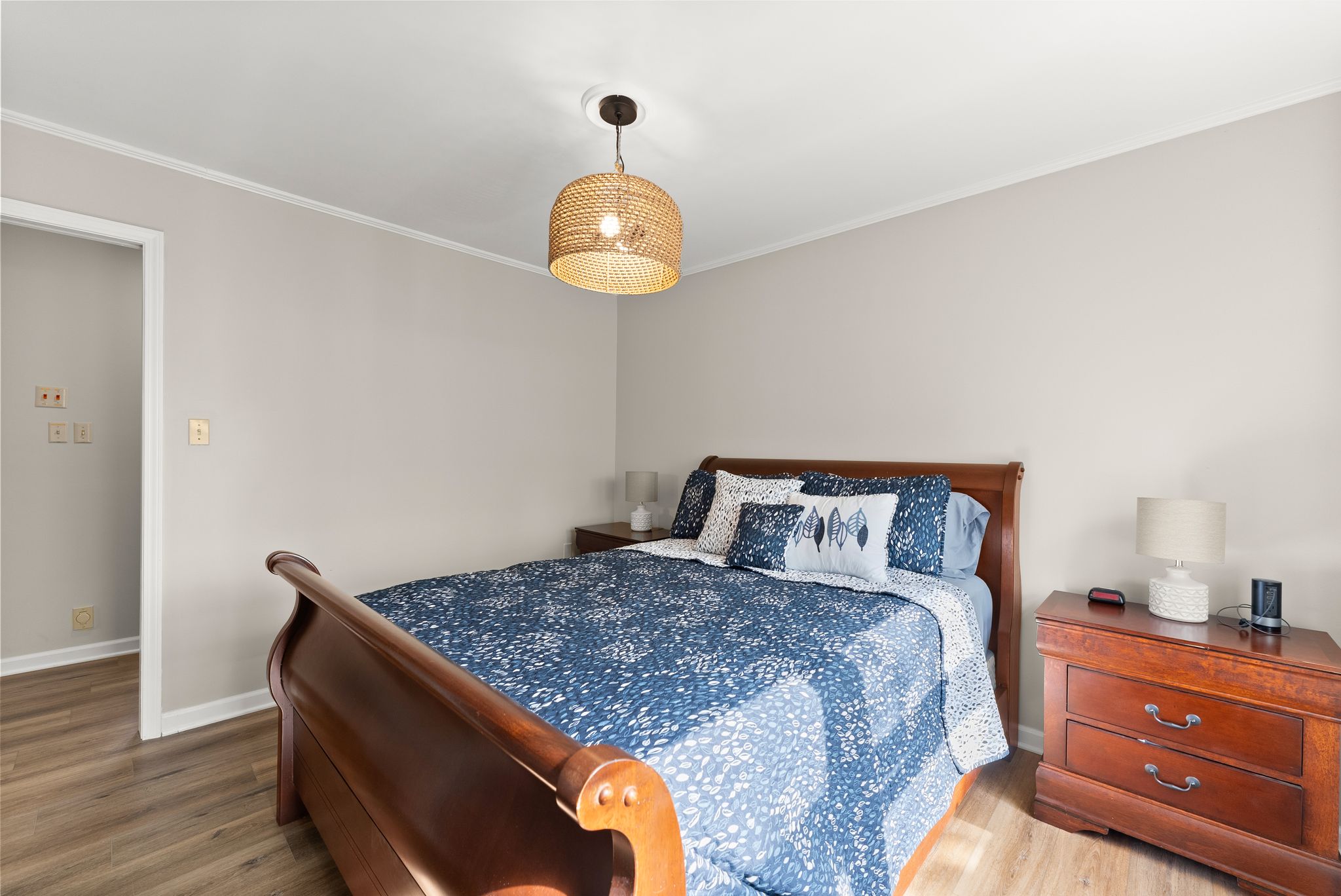 The primary suite on the main level is a true retreat, offering dual closets and a fully renovated spa-style bath with a double vanity, freestanding soaking tub, and a tiled walk-in shower. Upstairs, three additional bedrooms with walk-in closets provide plenty of space for family and guests.