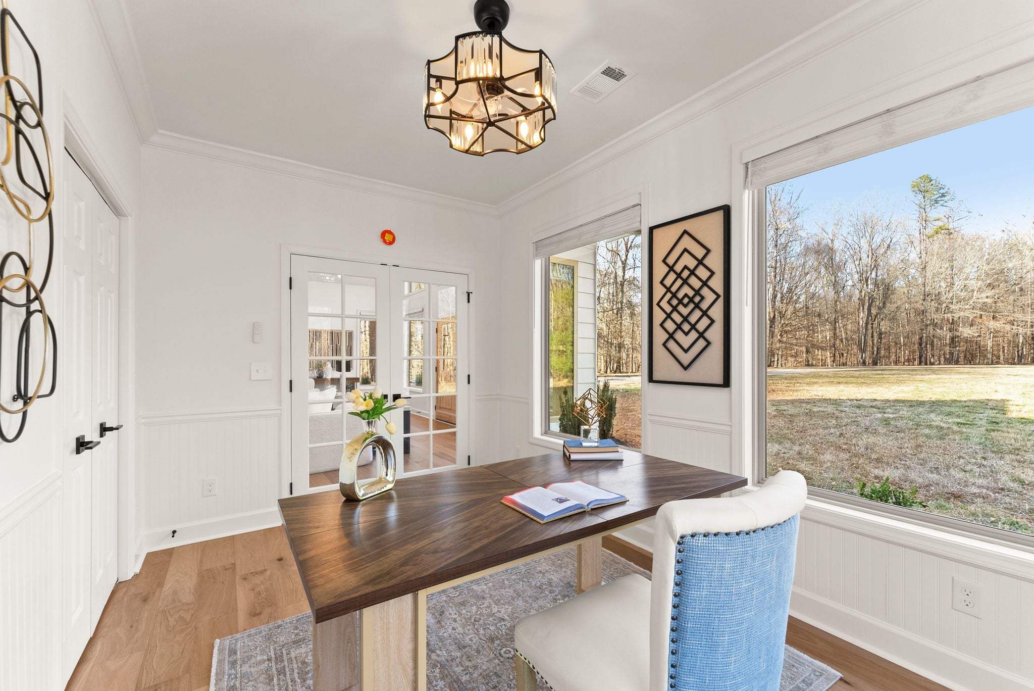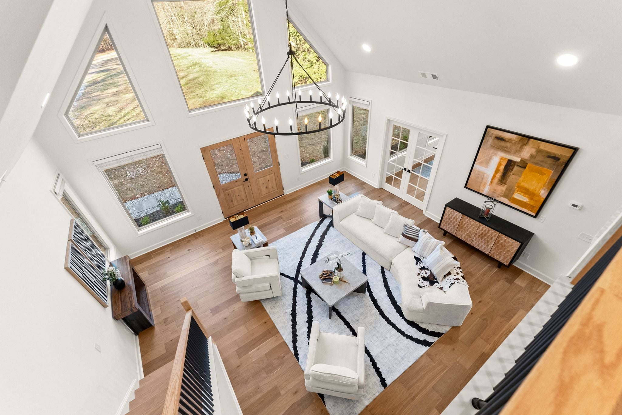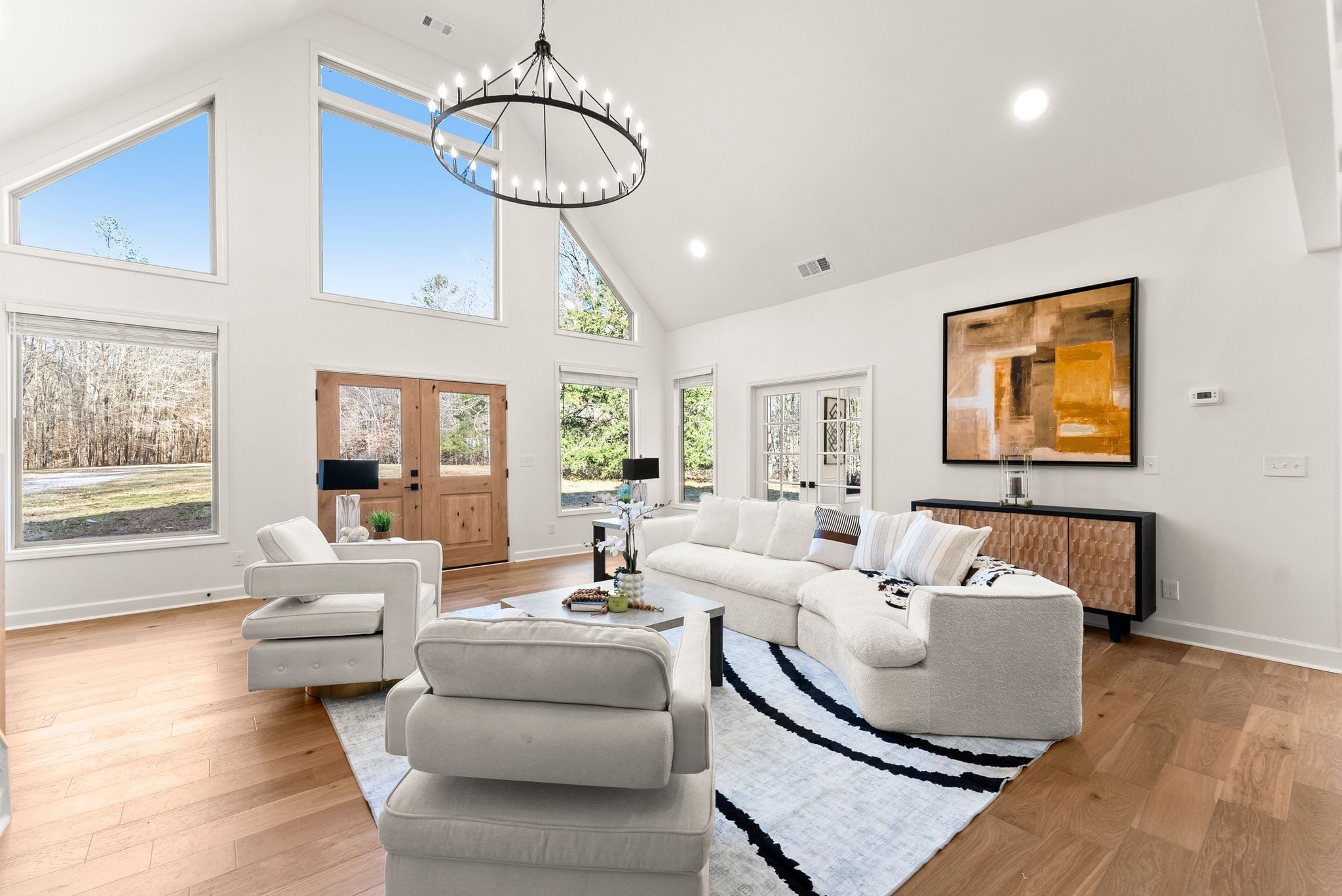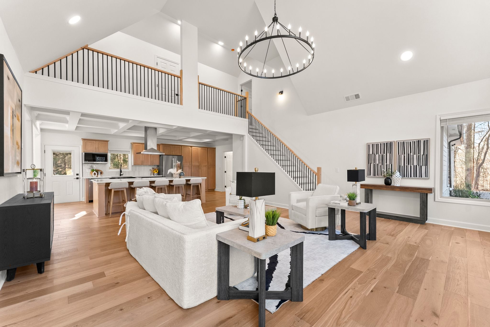The living room makes a striking impression with its two-story cathedral ceiling and oversized windows, flooding the space with natural light and offering serene views of the surrounding property. Thoughtful details continue with 9-foot ceilings throughout, beautiful trim work everywhere you look, and a dining room complete with a dedicated coffee bar area—perfect for entertaining or everyday enjoyment.