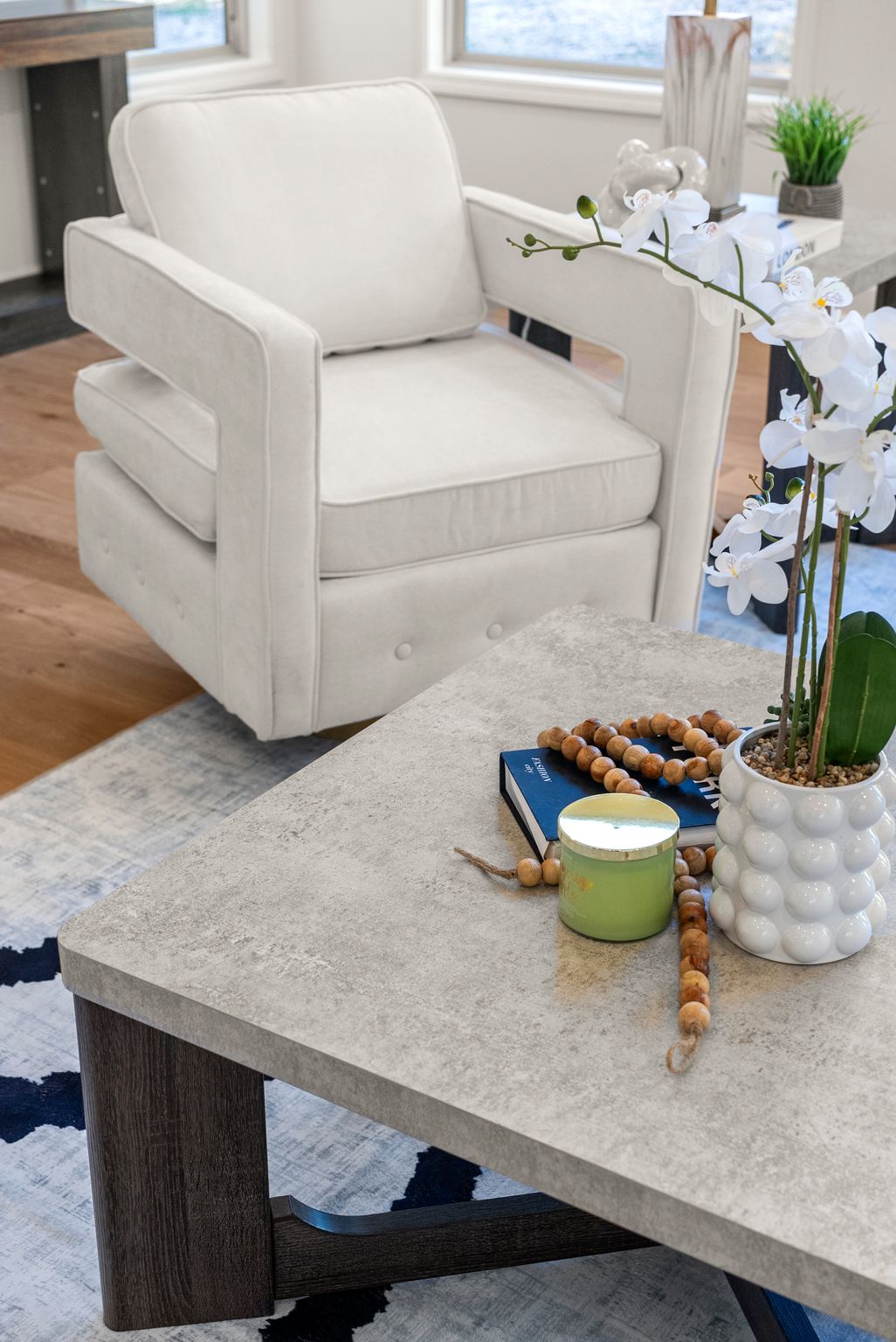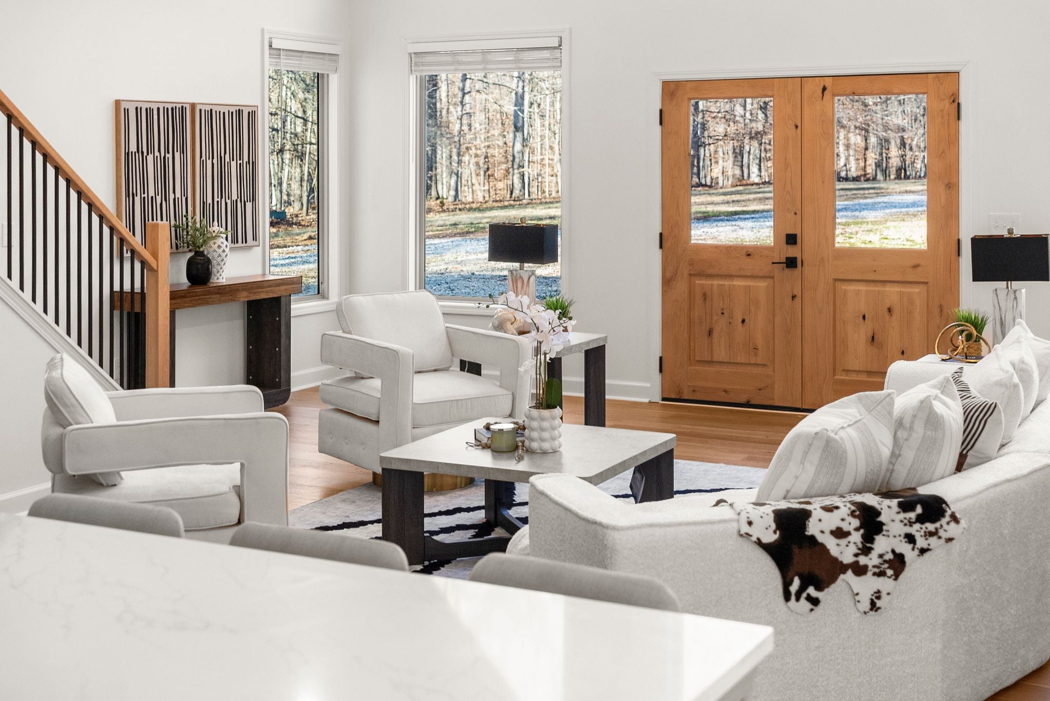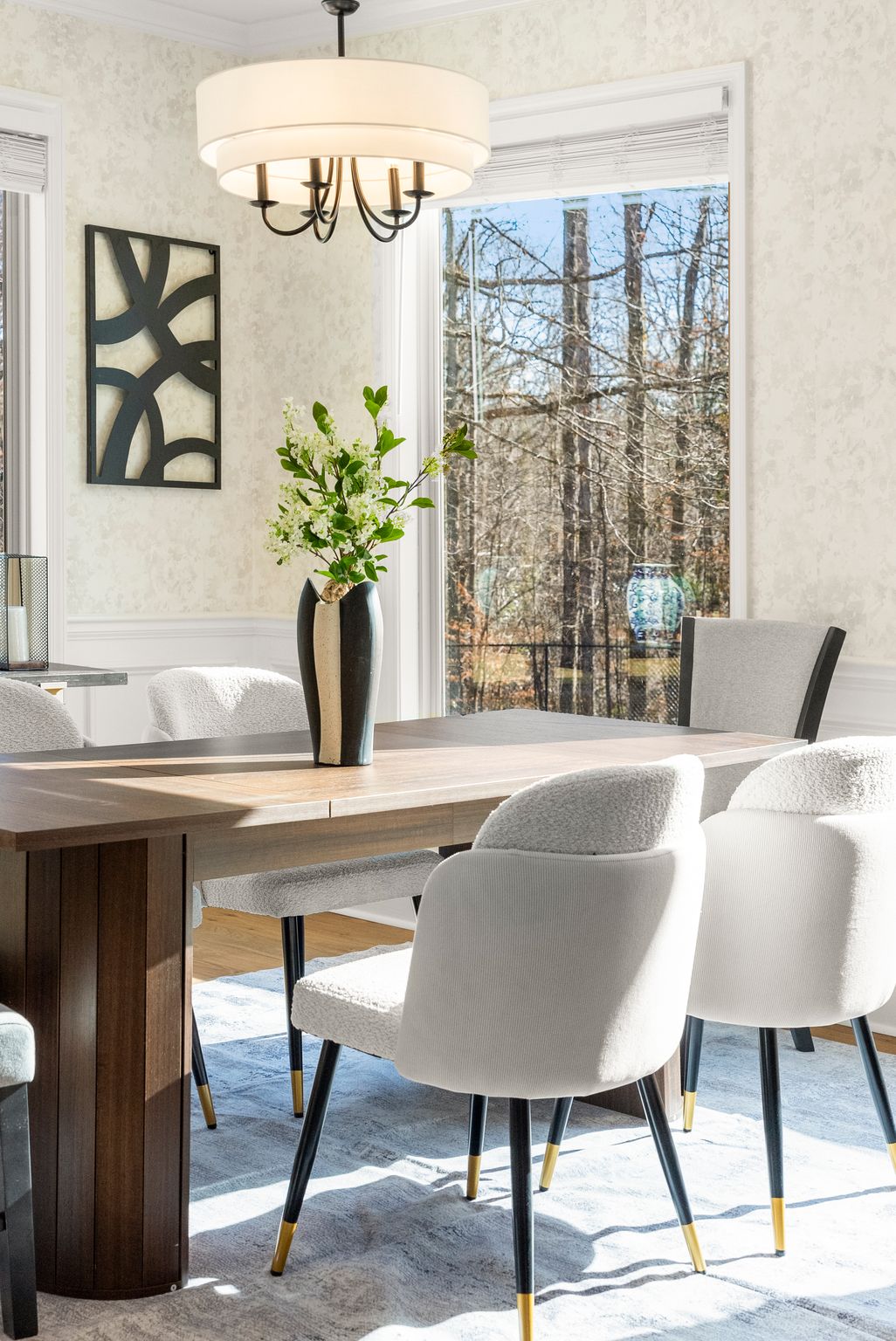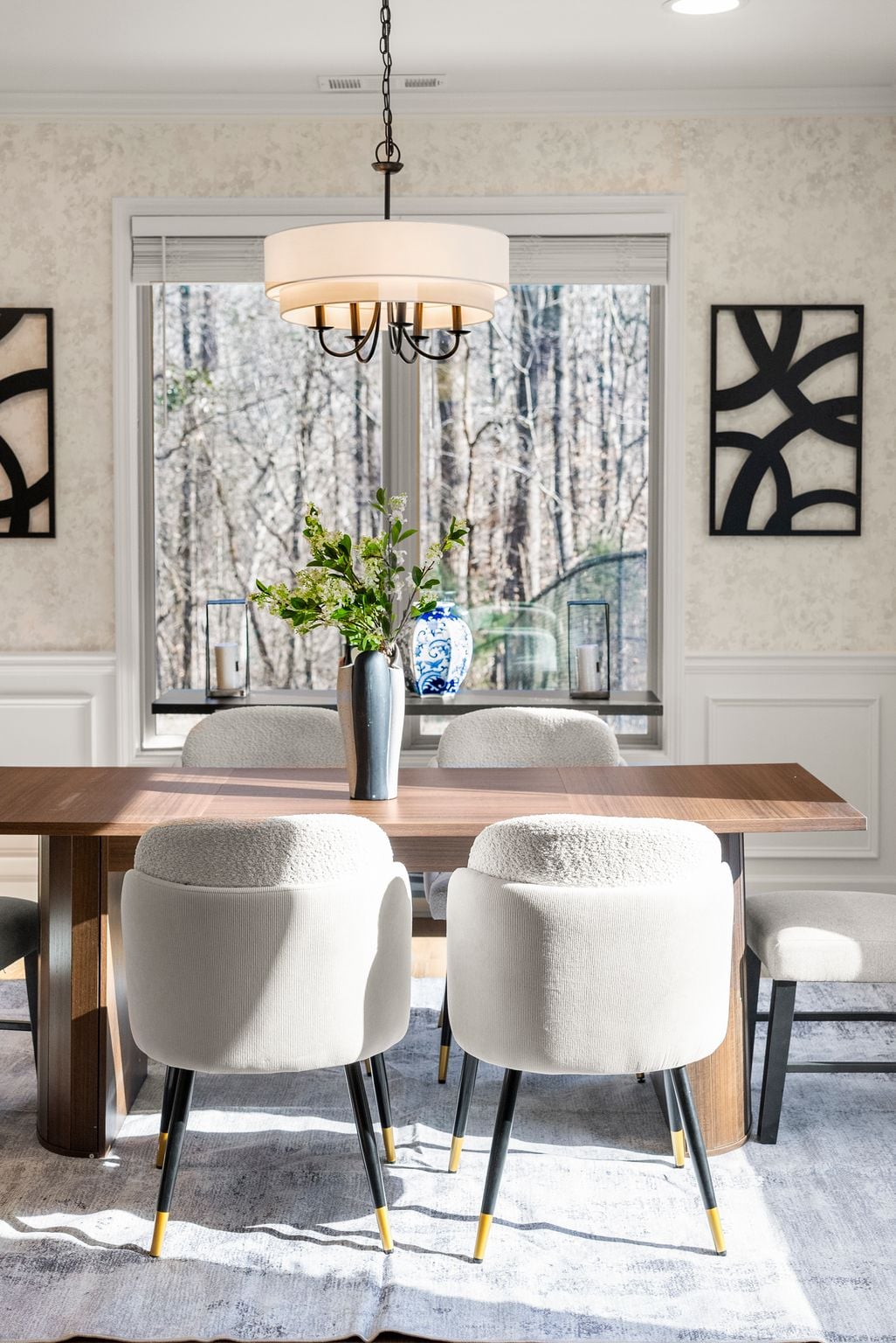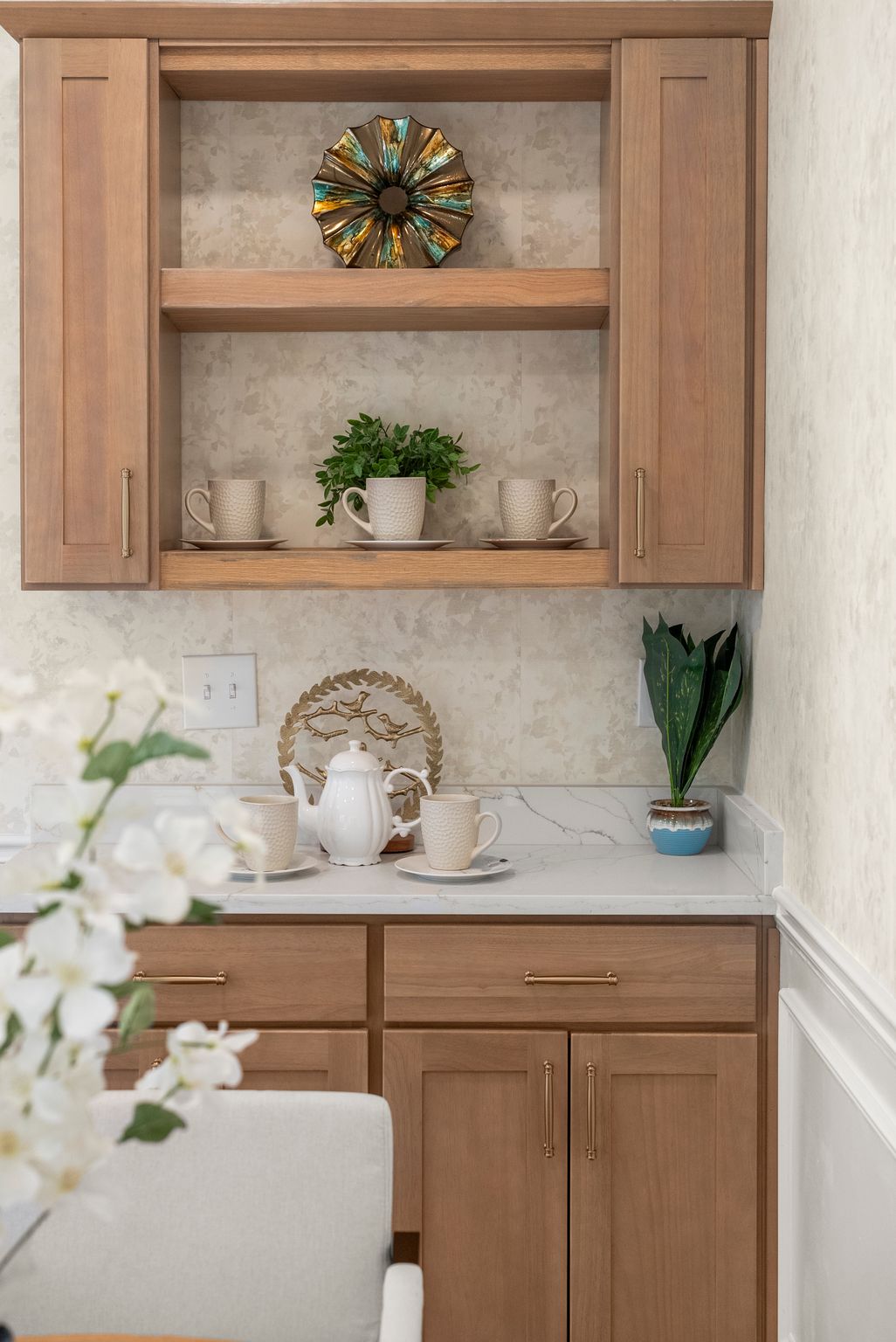 The living room makes a striking impression with its two-story cathedral ceiling and oversized windows, flooding the space with natural light and offering serene views of the surrounding property. Thoughtful details continue with 9-foot ceilings throughout, beautiful trim work everywhere you look, and a dining room complete with a dedicated coffee bar area—perfect for entertaining or everyday enjoyment.