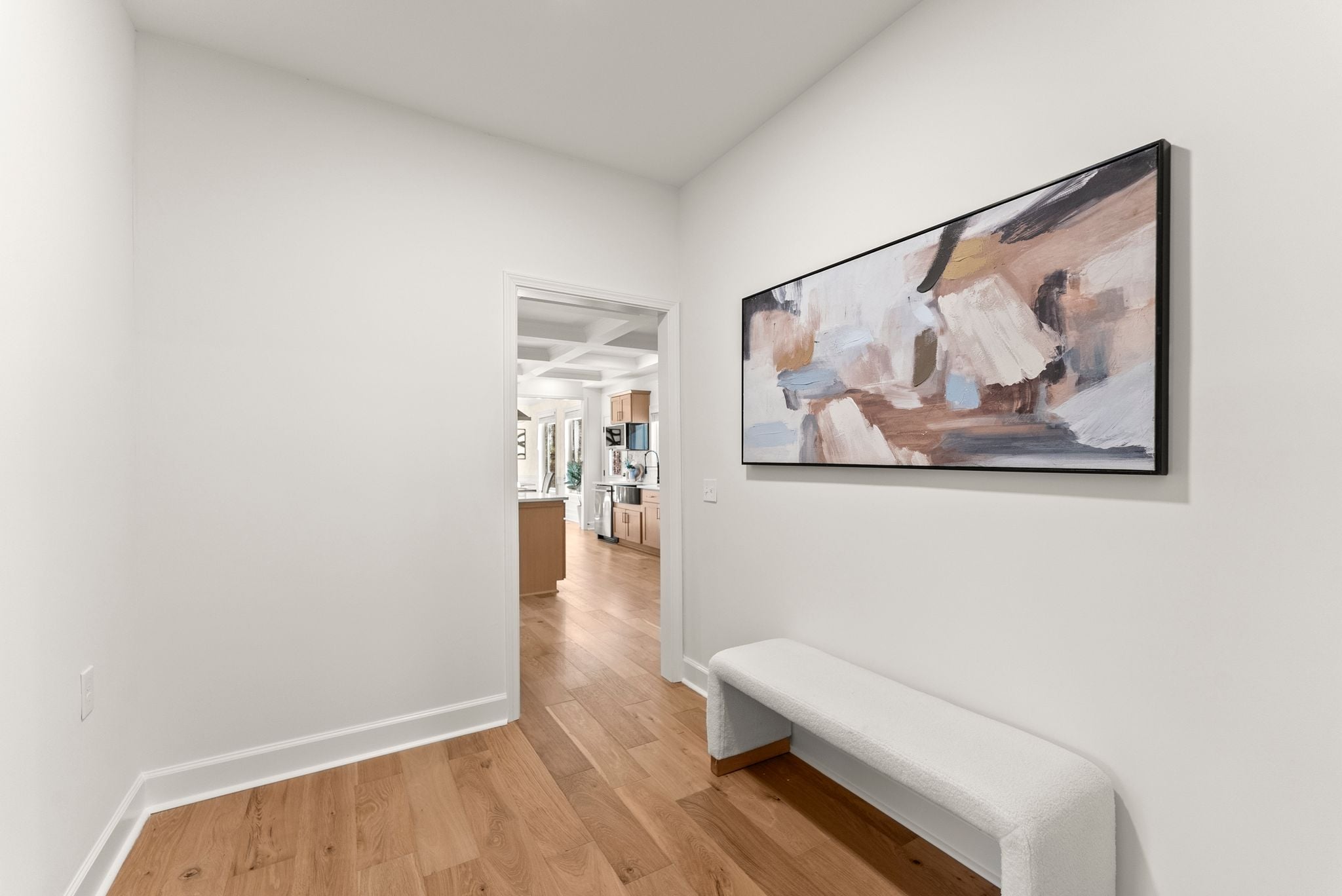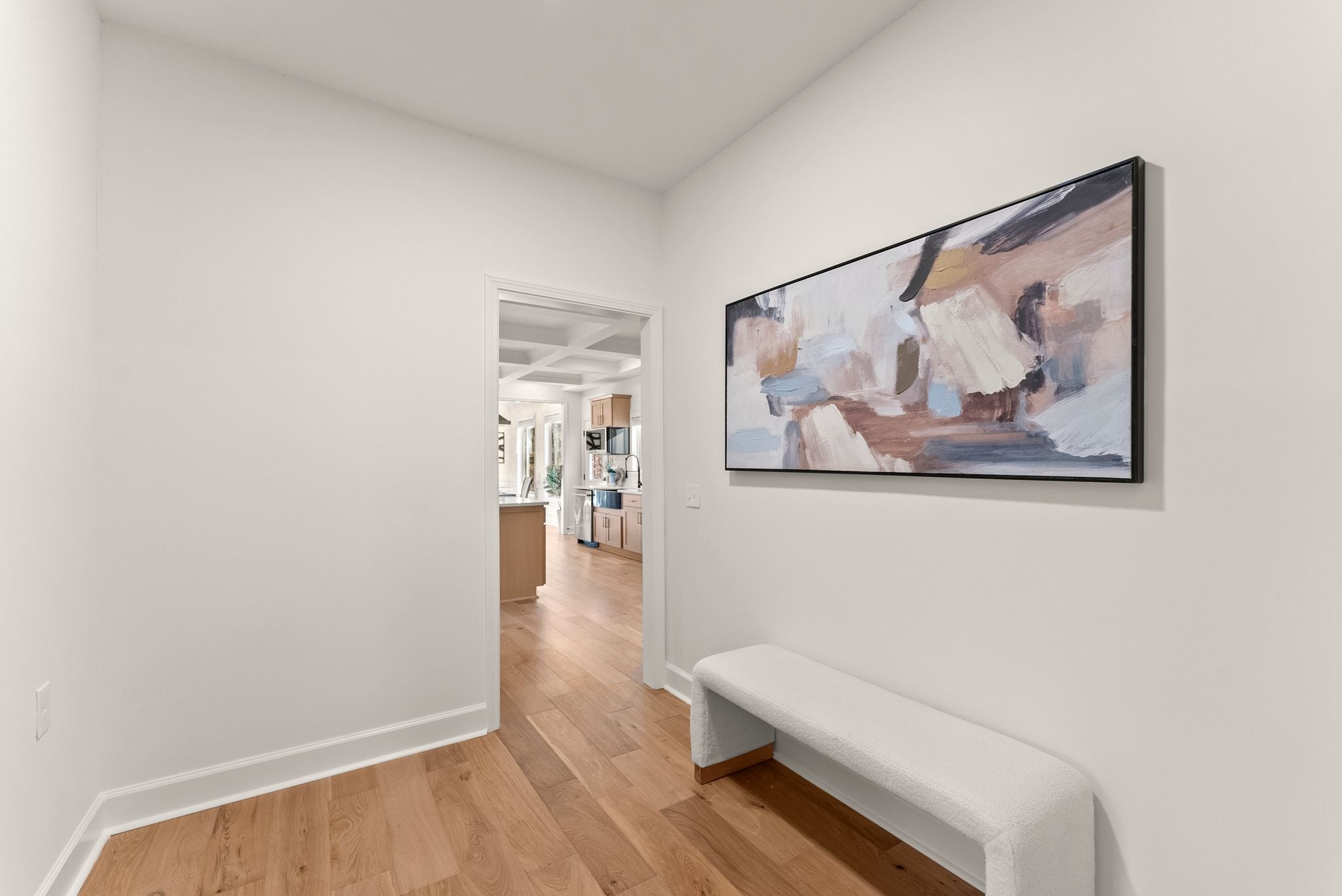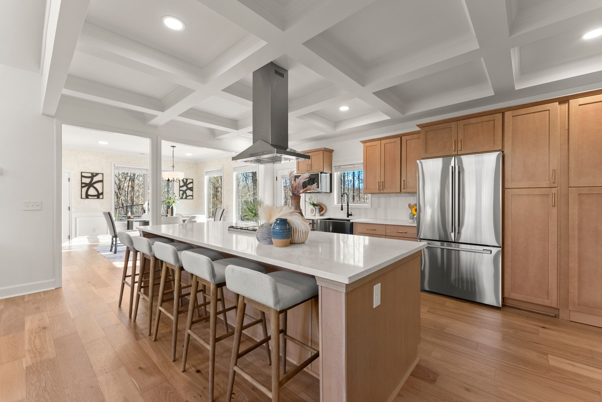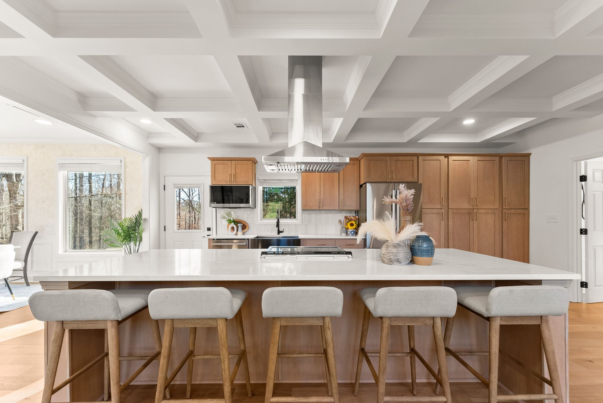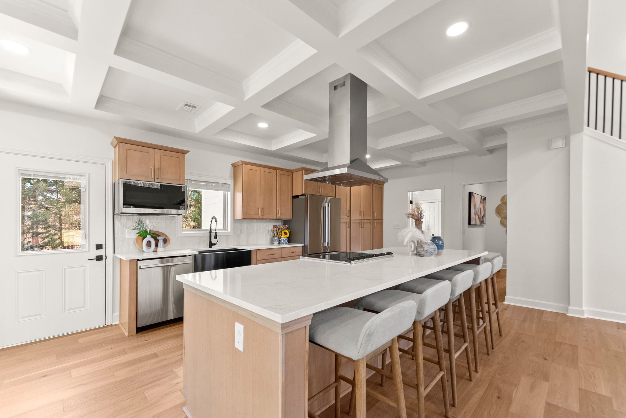 The heart of the home is the breathtaking kitchen, featuring custom cabinetry, stunning quartz countertops, stainless steel appliances, a massive center island, and coffered ceilings. A hidden walk-in pantry, seamlessly integrated within the cabinetry, adds both function and a touch of luxury. Brand-new French oak hardwood flooring flows throughout the entire house, complemented by fresh interior and exterior paint, a new HVAC system, and new lighting and plumbing fixtures throughout.