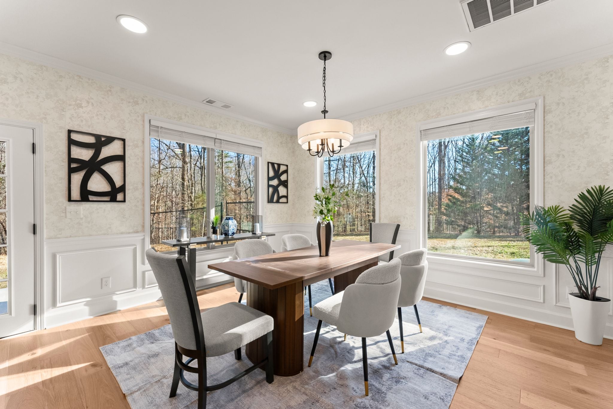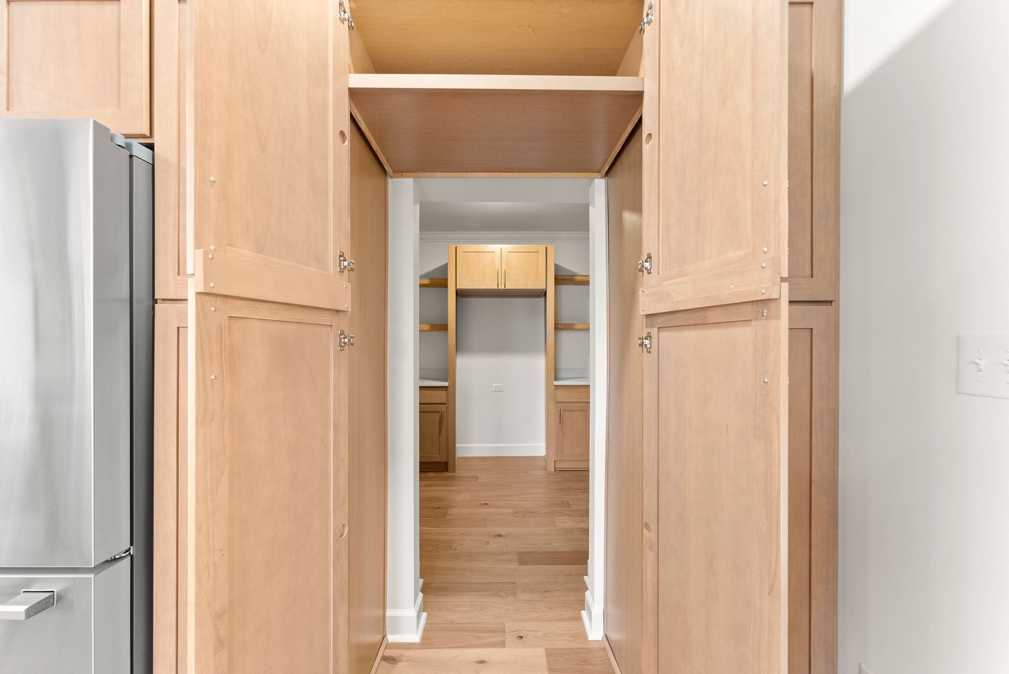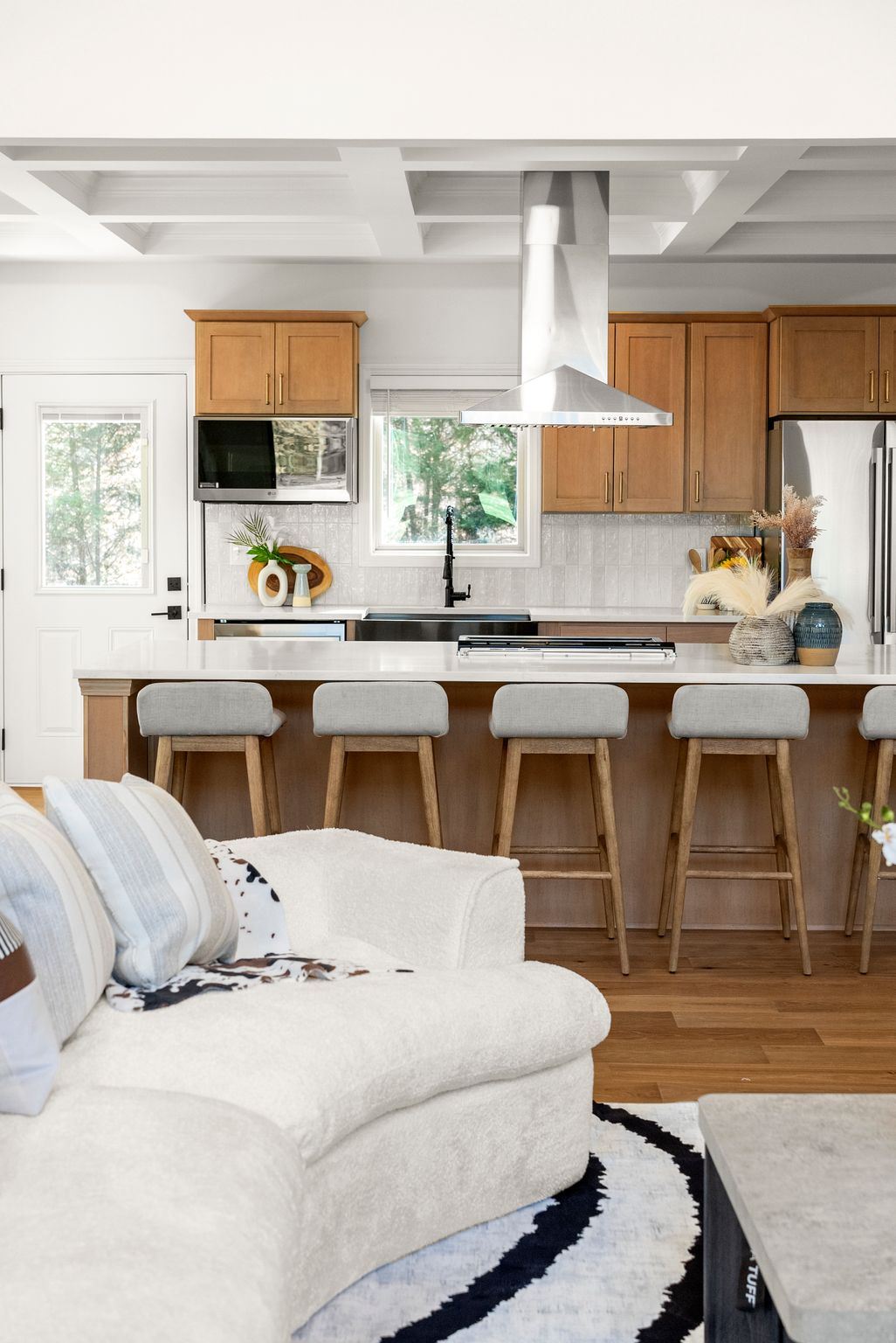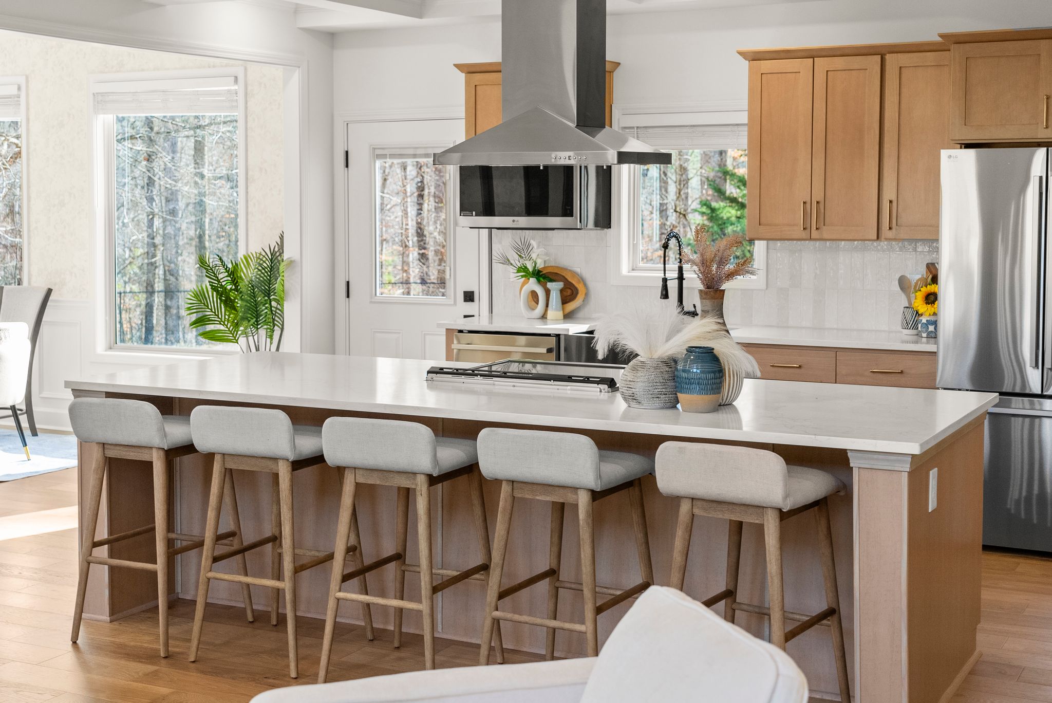 The heart of the home is the breathtaking kitchen, featuring custom cabinetry, stunning quartz countertops, stainless steel appliances, a massive center island, and coffered ceilings. A hidden walk-in pantry, seamlessly integrated within the cabinetry, adds both function and a touch of luxury. Brand-new French oak hardwood flooring flows throughout the entire house, complemented by fresh interior and exterior paint, a new HVAC system, and new lighting and plumbing fixtures throughout.